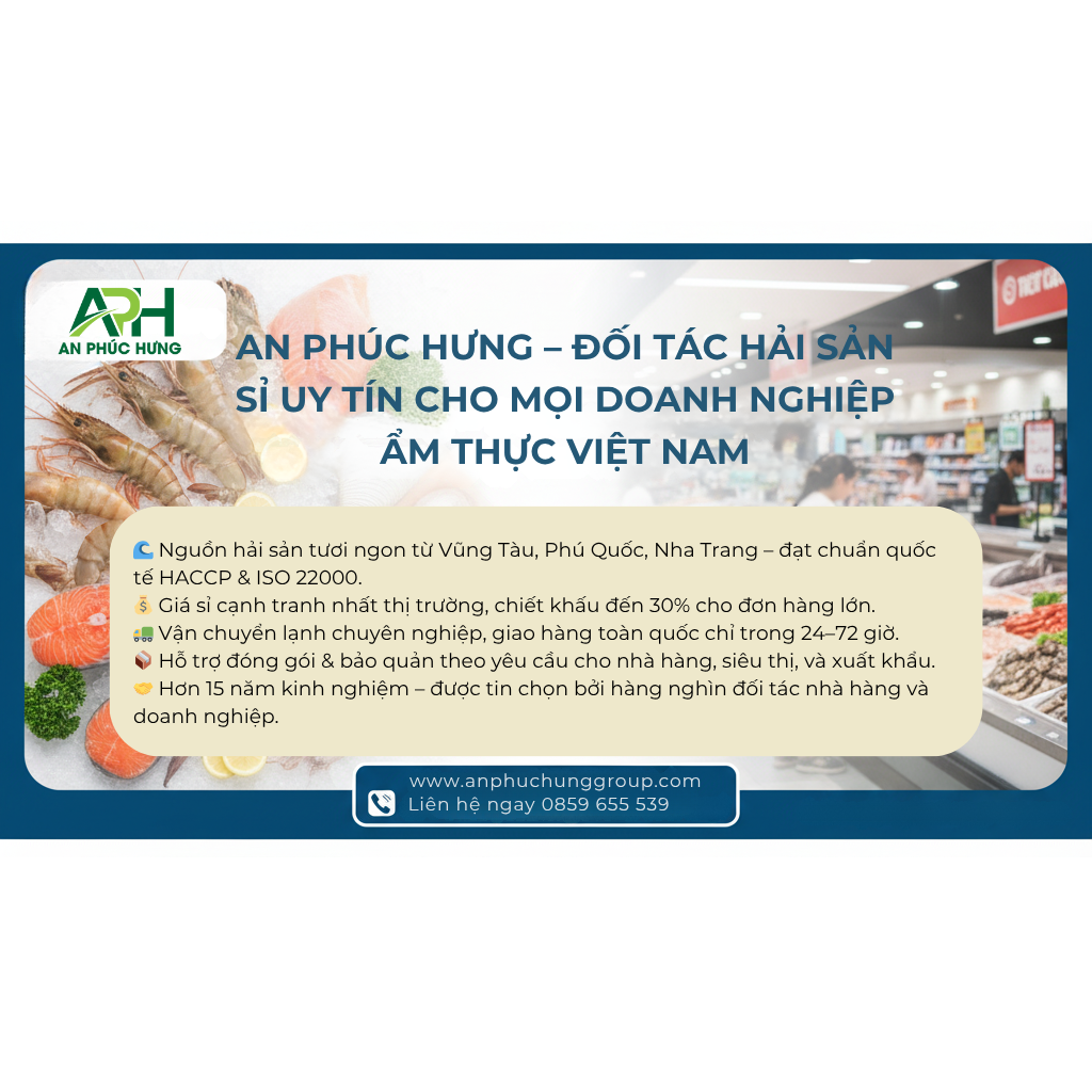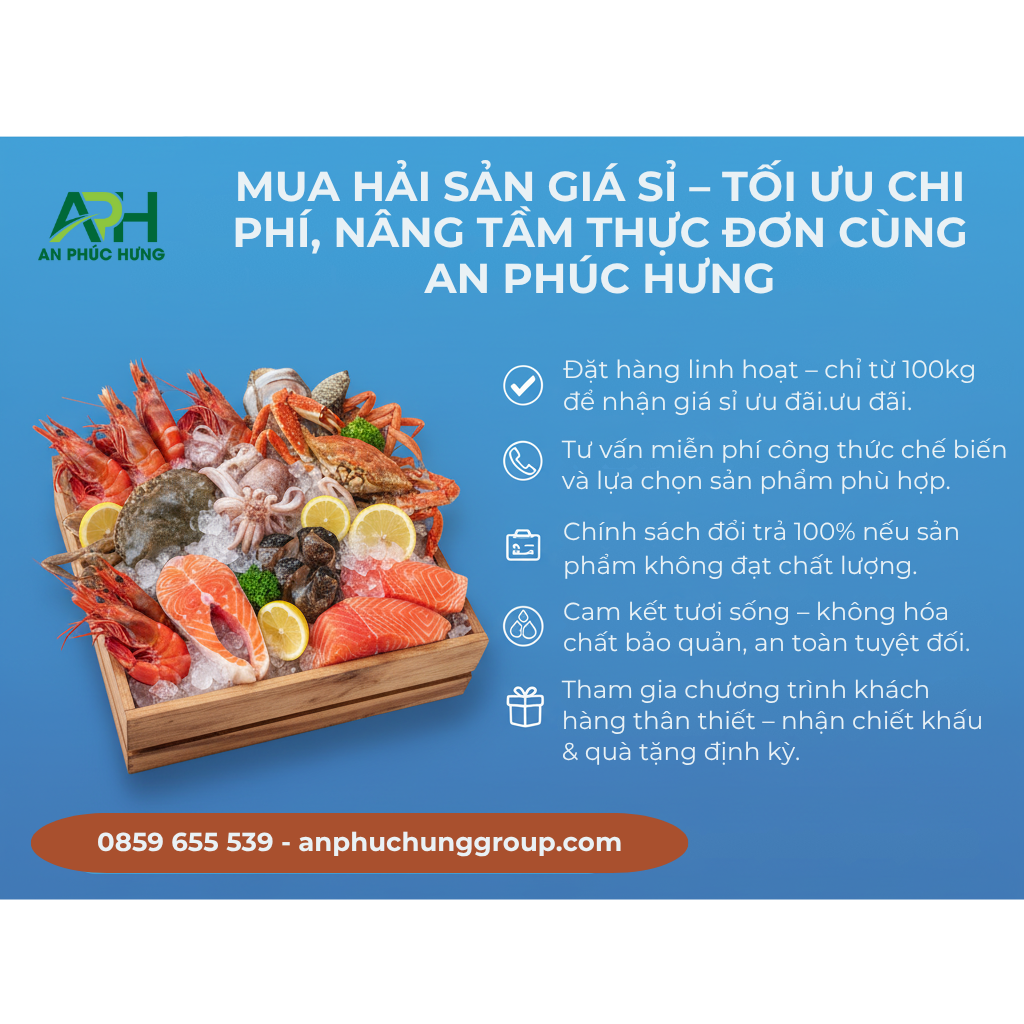 Mua hải sản giá sỉ uy tín tại An Phúc Hưng là giải pháp hoàn hảo cho các nhà hàng, khách sạn và doanh nghiệp xuất khẩu. Với sản phẩm tươi ngon, giá cả cạnh tranh và dịch vụ chuyên nghiệp, An Phúc Hưng không chỉ là nhà cung cấp mà còn là đối tác chiến lược giúp bạn nâng tầm thương hiệu. Hãy liên hệ ngay hôm nay qua địa chỉ TP Vũng Tàu, TP.HCM, điện thoại 0859655539, email dathang@anphuchunggroup.com hoặc website www.anphuchunggroup.com để trải nghiệm dịch vụ đẳng cấp. Chọn An Phúc Hưng để đảm bảo chất lượng và thành công cho doanh nghiệp của bạn!